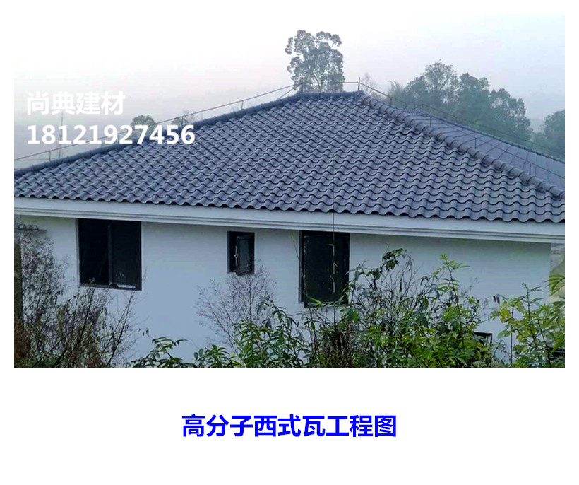 高分子西式瓦是采用專用于室外耐候性十分優(yōu)秀的高分子特種工業(yè)樹脂經(jīng)高溫高壓模壓而成。產(chǎn)品輕質(zhì)高強、色彩豐富、光潔亮麗,造型既具有古樸典雅的復古風格,又具有高端大氣的現(xiàn)代氣息,是古典的厚重與現(xiàn)代材質(zhì)工藝的完美結(jié)合。高分子西式瓦與傳統(tǒng)的燒結(jié)瓦相比,具有單張面積大、安裝簡便快捷、安裝工資低、節(jié)約原輔材料等優(yōu)勢。產(chǎn)品集防水、隔熱、裝飾于一體,是現(xiàn)代建筑理想的用瓦選擇。廣泛用于別墅建筑、風景區(qū)、公園樓亭、高檔建筑等建筑屋面。