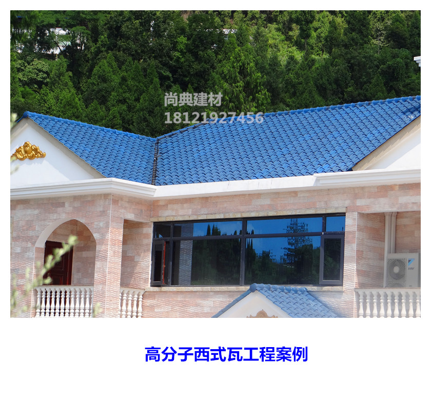 高分子西式瓦是采用專用于室外耐候性十分優(yōu)秀的高分子特種工業(yè)樹脂經(jīng)高溫高壓模壓而成。產(chǎn)品輕質(zhì)高強、色彩豐富、光潔亮麗,造型既具有古樸典雅的復(fù)古風(fēng)格,又具有高端大氣的現(xiàn)代氣息,是古典的厚重與現(xiàn)代材質(zhì)工藝的完美結(jié)合。高分子西式瓦與傳統(tǒng)的燒結(jié)瓦相比,具有單張面積大、安裝簡便快捷、安裝工資低、節(jié)約原輔材料等優(yōu)勢。產(chǎn)品集防水、隔熱、裝飾于一體,是現(xiàn)代建筑理想的用瓦選擇。廣泛用于別墅建筑、風(fēng)景區(qū)、公園樓亭、高檔建筑等建筑屋面。