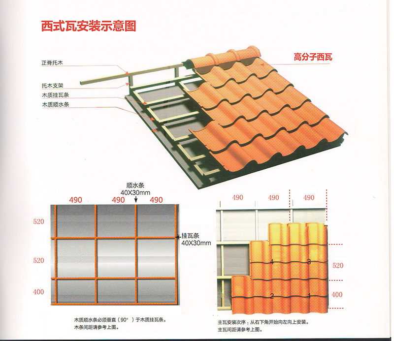 掛瓦條的尺寸:40mm*30mm,用45mm長的鍍鋅鋼釘釘在順?biāo)畻l上。