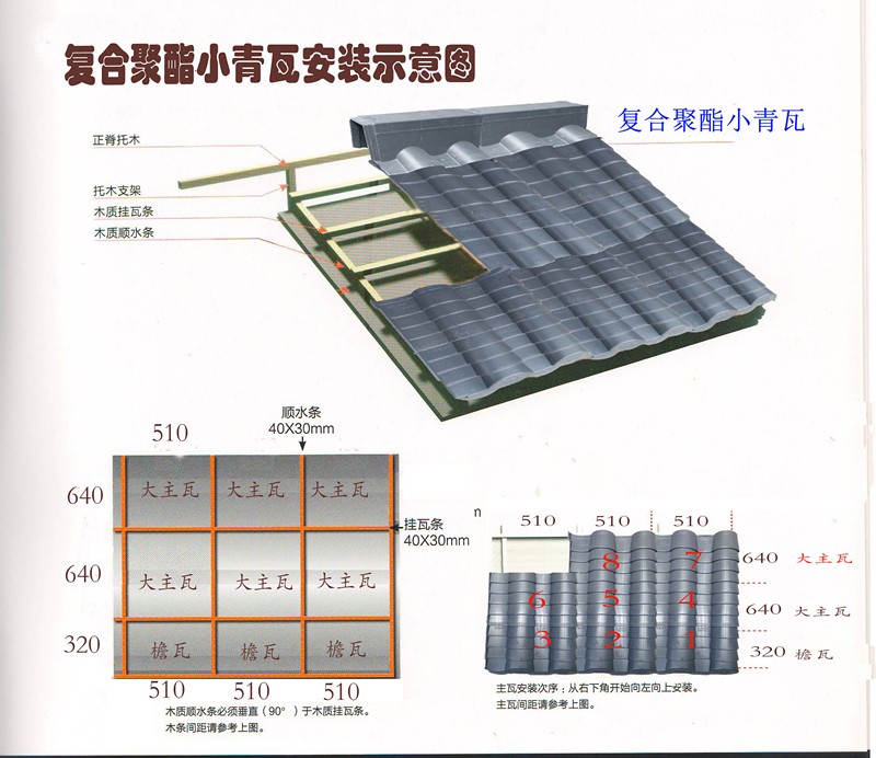與傳統(tǒng)瓦的優(yōu)勢:復(fù)合聚酯小青瓦輕質(zhì)高強,單張面積大安裝簡便快捷,不用作基層材料,不用作防水材料,不用水泥沙漿粘貼, 防水效果好,終身不需要維修,表面光潔亮麗、不失光、不褪色可以保持長久如新。