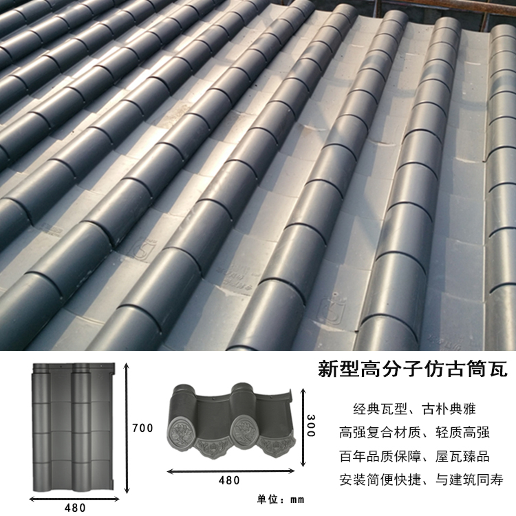 筒瓦,古樸典雅,是古建筑不二之選,新型材料的高分子仿古筒瓦繼承了中華民族古建筑的優(yōu)秀風(fēng)格。