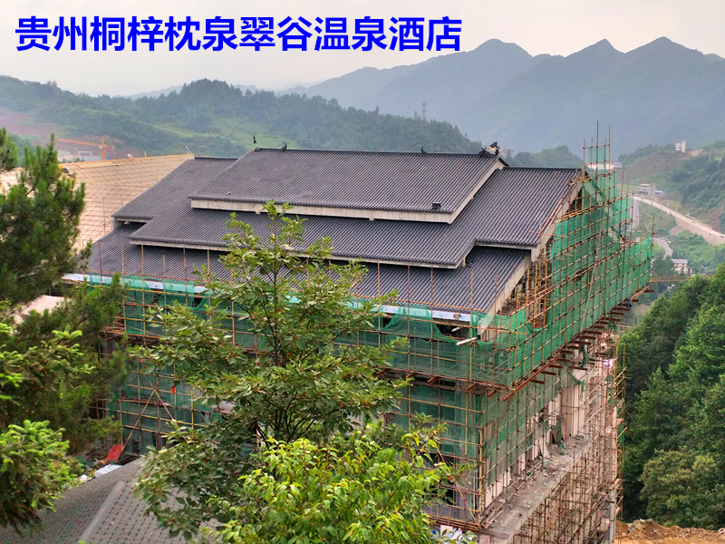 貴州桐梓“枕泉翠谷”4A景區(qū)五星級(jí)大酒店,是該景區(qū)唯一的一處星級(jí)大酒店。酒店設(shè)計(jì)為純中式徽派建筑風(fēng)格,雄壯氣派,是該景區(qū)最亮眼的一道獨(dú)特風(fēng)景,酒店業(yè)主方對(duì)“彰顯建筑風(fēng)格、體現(xiàn)建筑檔次及建筑文化元素”的屋面瓦十分挑剔,對(duì)屋面瓦的選定采用了投標(biāo)比選模式進(jìn)行篩選,并提出了硬性的屋面瓦標(biāo)準(zhǔn):“與建筑風(fēng)格匹配的中式仿古琉璃 瓦瓦型、施工周期短、防水隔熱效果好、無(wú)安全隱患、使用壽命長(zhǎng)、色澤古樸厚重等標(biāo)準(zhǔn),