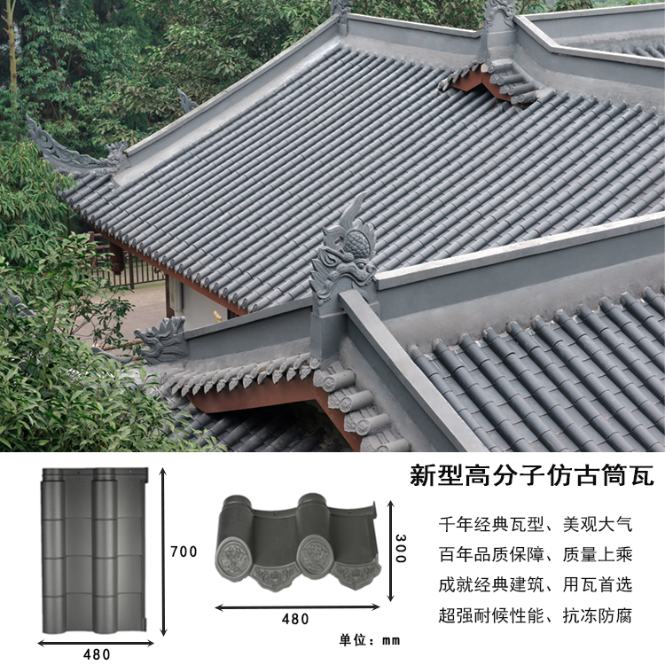 高分子仿古瓦輕質(zhì)高強(qiáng)、美觀環(huán)保、色澤豐富、安裝快捷,綜合性價(jià)比高。